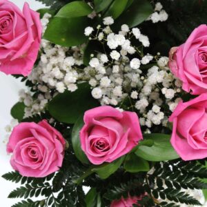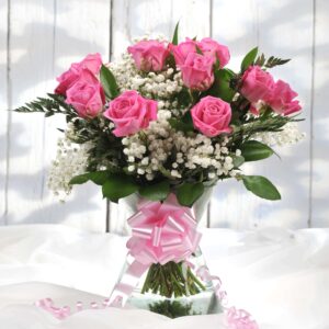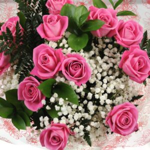Assortment of 12 pink roses, a beautiful bouquet for when you’re wanting to add an extra touch of femininity to your home or are you’re wanting to send a friend a kind surprise. Fresh pink roses with lush fresh foliage and gypsophila a delightful combination.