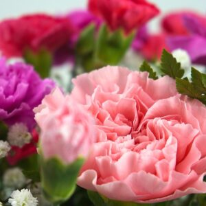 A traditional carnation flowers bouquet that consists of delicate shades of pink, and with the added touch of white Gypsophila to make the colours stand out. To finish off the floral arrangement we add fresh foliage to give your bouquet that extra volume.