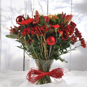 Show someone that you’re thinking about them this festive season by sending them this stunning Christmas hand tied bouquet which consists of an array of red flowers to fit in with the theme of Christmas. The deep reds are sure to be eye catching among the rest of your seasonal decor, so treat yourself or a friend to this gorgeous flower delivery and make this Christmas season feel special. These flowers by post will arrive on the doorstep already arranged by one of our professional florists, and if that isn’t enough then this flower delivery also includes beautiful gold and red baubles making this bouquet a gift that keeps on giving.