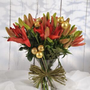 This magical Christmas Bouquet will bring festive colour and warmth to any location, whether that be a centrepiece for the Christmas dinner table or simply on a sideboard to stand out on its own. The vibrant Red Asiatic lilies will be sure to attract attention and make a statement in your Christmas decor, we also include golden baubles within this bouquet to create a luxury contrast of colours as well as to add that extra festive feel. This beautiful bunch of Asiatic lilies arrives already pre arrange by one of our trusted florists and is framed by our favourite choice of fresh foliage to create a stunning floral arrangement that will compliment your decor this Christmas season.