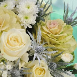 A stunning array of hand-picked all-white premium blooms including White Roses, White Carnations combined with Thistle and seasonal foliage in luxury gift wrap this bouquet is sure to bring a smile to the face of your someone special.