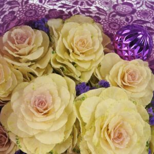 A selection of carefully hand picked White Cabbages framed by Purple Statice and fresh foliage to add that little bit of extra spice as well as to accentuate the crisp white colour of the Cabbage Roses. A hand tied bouquet that keeps it simple with having one main focal flower, to fit the needs of those who prefer something more specific and always opt against having a wide variety. This flower delivery will arrive to the recipient all ready and arranged by one of our in store florists, who also check the quality of each individual cabbage to make sure that only the best is being sent out, leaving the only thing left to think about being where the stunning floral arrangement will look best.