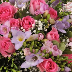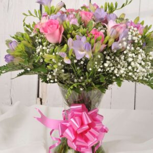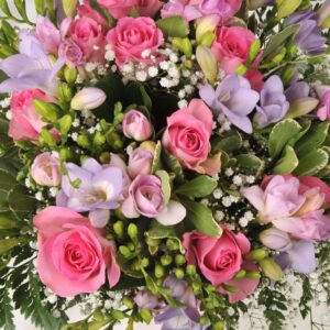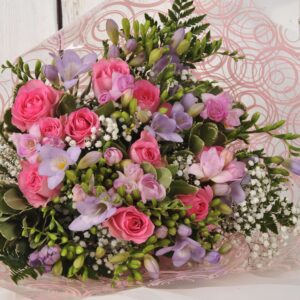 Are you looking for a carefully chosen Birthday gift of a simple token of gratitude? This delicate bouquet could be the answer. We carefully select 10 of our finest Pink Roses and nestle them amongst sprigs of Freesia, Gypsophilia and seasonal greenery to bring you one of our most versatile bouquets.