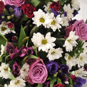 With the purple hues used signifying dignity this purple white bouquet could be used to express your condolences and sympathy.